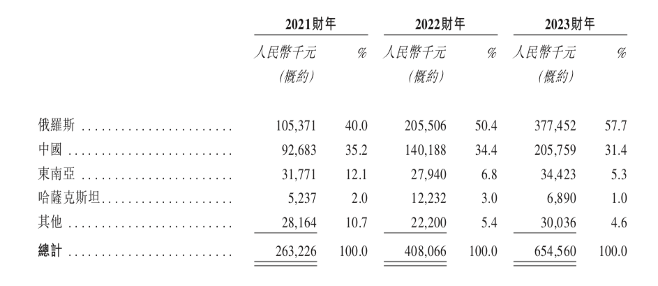 舒宝国际当年无心插柳的俄罗斯市场,迎来大爆发。2023年,公司收入直接从2021年的2.63亿元翻倍到6.55亿元,其中俄罗斯市场占比接近六成。