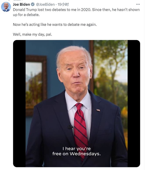 5月15日,拜登在X平台发视频,嘲讽特朗普在2020年总统大选的辩论中两次成为自己的手下败将。