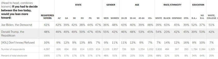 周一,《纽约时报》、锡耶纳学院和《费城询问报》的联合民调显示,6个关键摇摆州——密歇根、威斯康星、佐治亚、内华达、亚利桑那和宾夕法尼亚之中,拜登仅在威斯康星以47%的支持率领先特朗普的45%,其余5州皆为特朗普占上风。