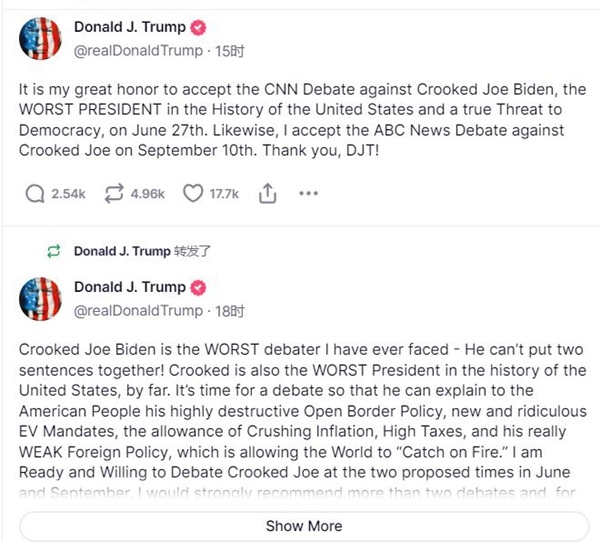 拜登发视频后不久,特朗普在自己的社交媒体Truth Social连发多条信息。他接受了拜登发出的挑战,宣布将于6月27日在CNN电视台与拜登举行第一场辩论,第二场辩论于9月10日在ABC电视台举行。