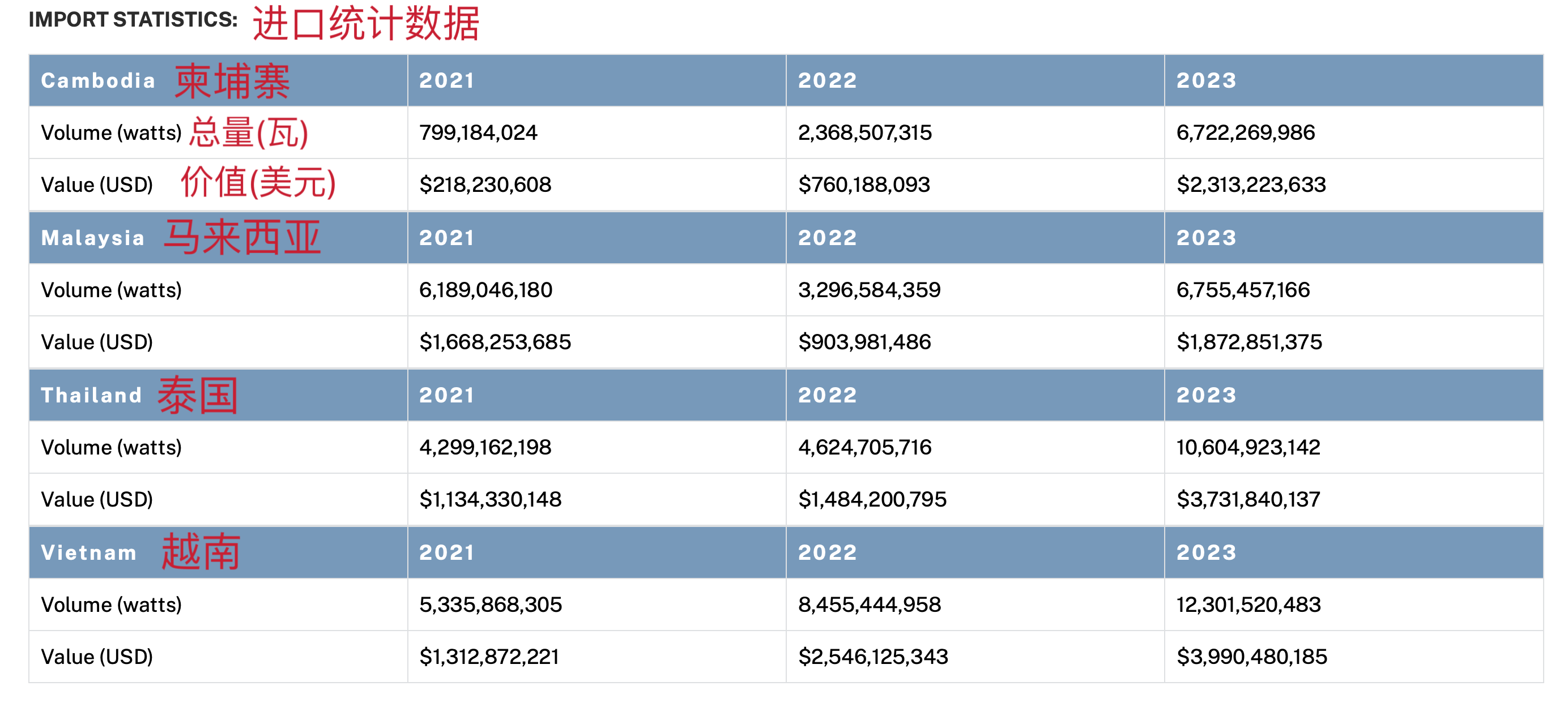 据美方统计,2023年美国自各涉案国家进口被调查产品的金额分别约为:柬埔寨23亿美元、马来西亚19亿美元、泰国37亿美元、越南40亿美元。