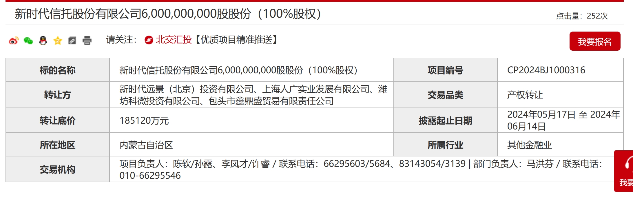 5月16日,北京产权交易所挂出新时代信托60亿股股份(100%股权)转让信息,信息披露自2024年5月17日起,至2024年6月14日止,转让底价18.51亿元。