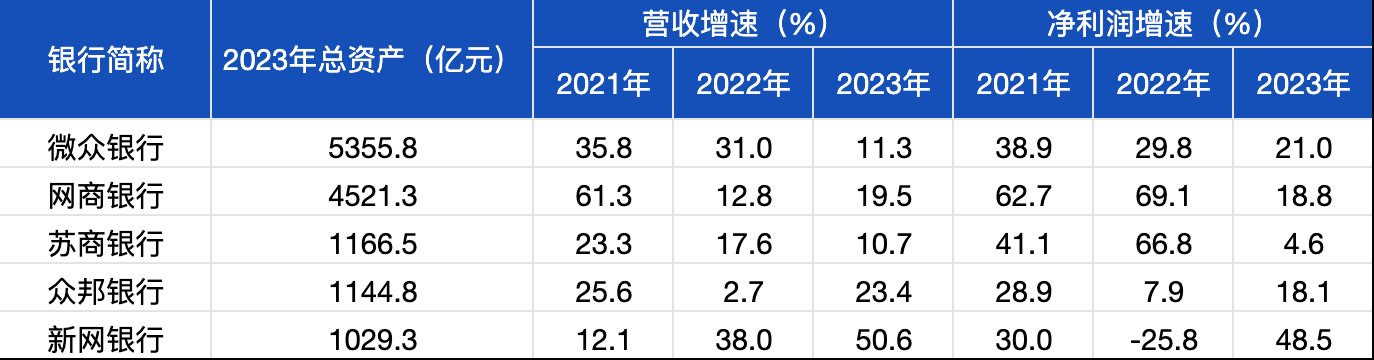 2023年,民营银行千亿俱乐部再次迎来扩容,新网银行凭借1029.3亿元的资产规模昂首挺进,从营收、净利润的增速上看,新网银行也是头部五家民营银行中表现最优的一家。
