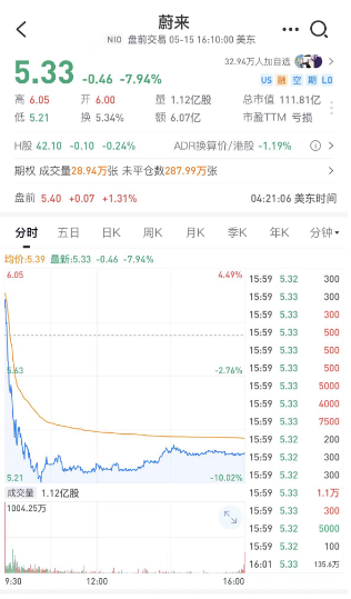 发布会刚刚结束,蔚来股价就大跳水。到今天收盘,蔚来报收5.33美元,较开盘时下跌7.94%。