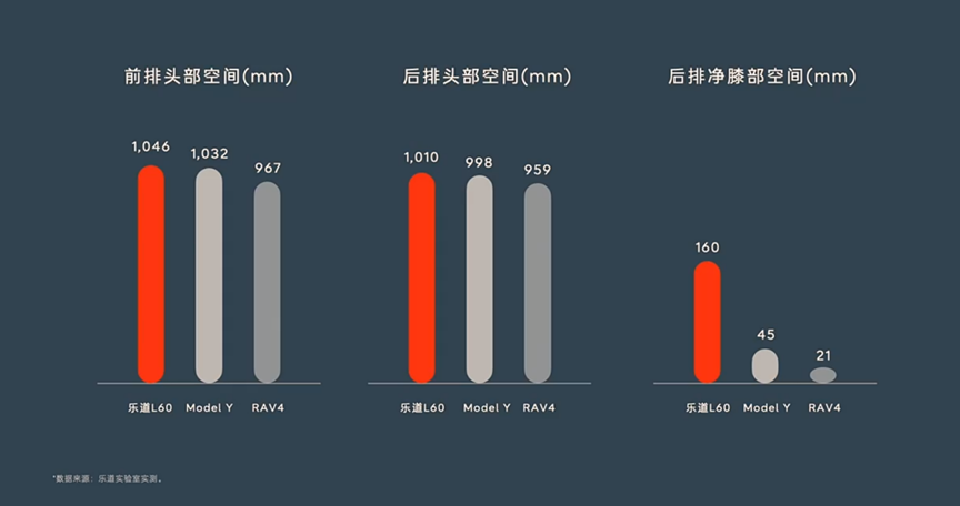 从乐道给出的数据来看,乐道L60后排的净膝部空间为160mm,是Model Y的3.5倍,也是RAV4的7.5倍。