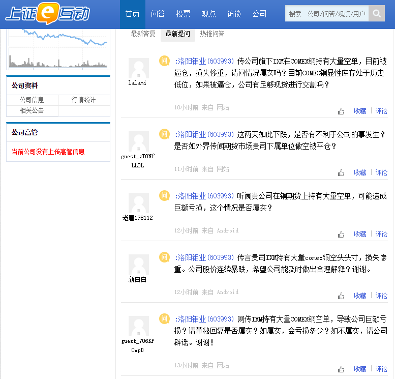 当日早盘,有多位投资者突然在互动平台追问洛阳钼业:“传公司旗下IXM在COMEX铜持有大量空单,目前被逼仓,损失惨重,请问情况属实吗?目前COMEX铜显性库存处于历史低位,如果被逼仓,公司有足够现货进行交割吗?”“传言贵司IXM持有大量COMEX铜空头头寸,损失惨重。公司股价连续暴跌,希望公司能及时做出合理解释?”