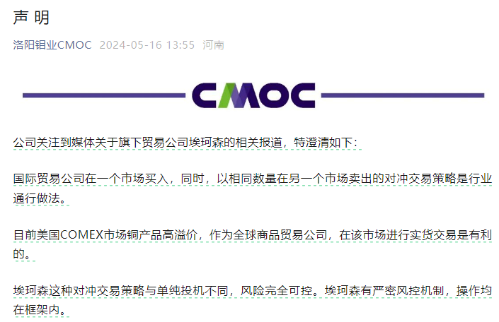 随后下午13时55分,洛阳钼业官方微信紧急发布声明称,旗下贸易公司埃珂森(IXM)这种对冲交易策略与单纯投机不同,风险完全可控。埃珂森有严密风控机制,操作均在框架内。
