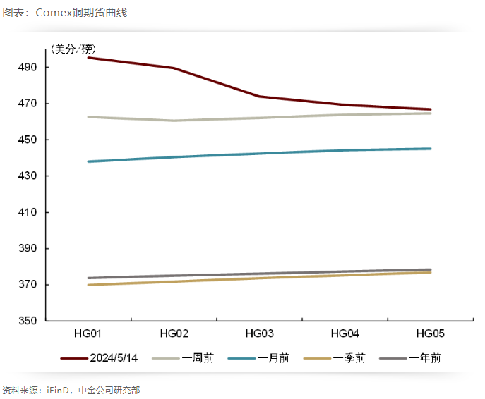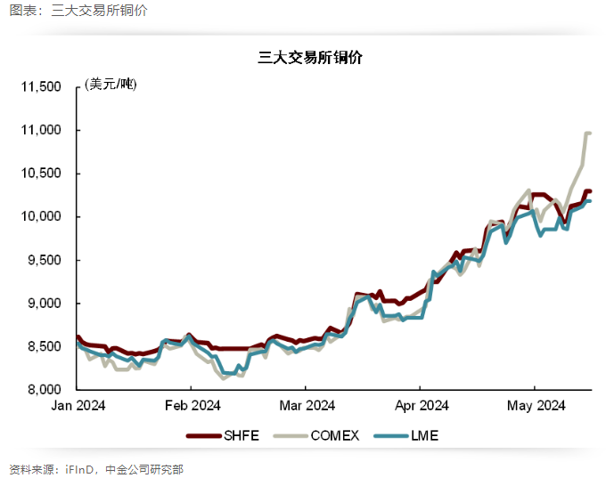中金公司大宗商品团队5月16日发文表示,今年4月初至今,COMEX铜库存几乎连续去库,由4月初的接近3万吨下降至5月14日的2.1万吨。“结合全球精炼铜的供给情况,预计中国铜产量增长是全球铜产量上升的主要贡献力量,而COMEX无法接受中国品牌精炼铜交割,这或许也成为了COMEX铜价溢价扩大的原因之一。”