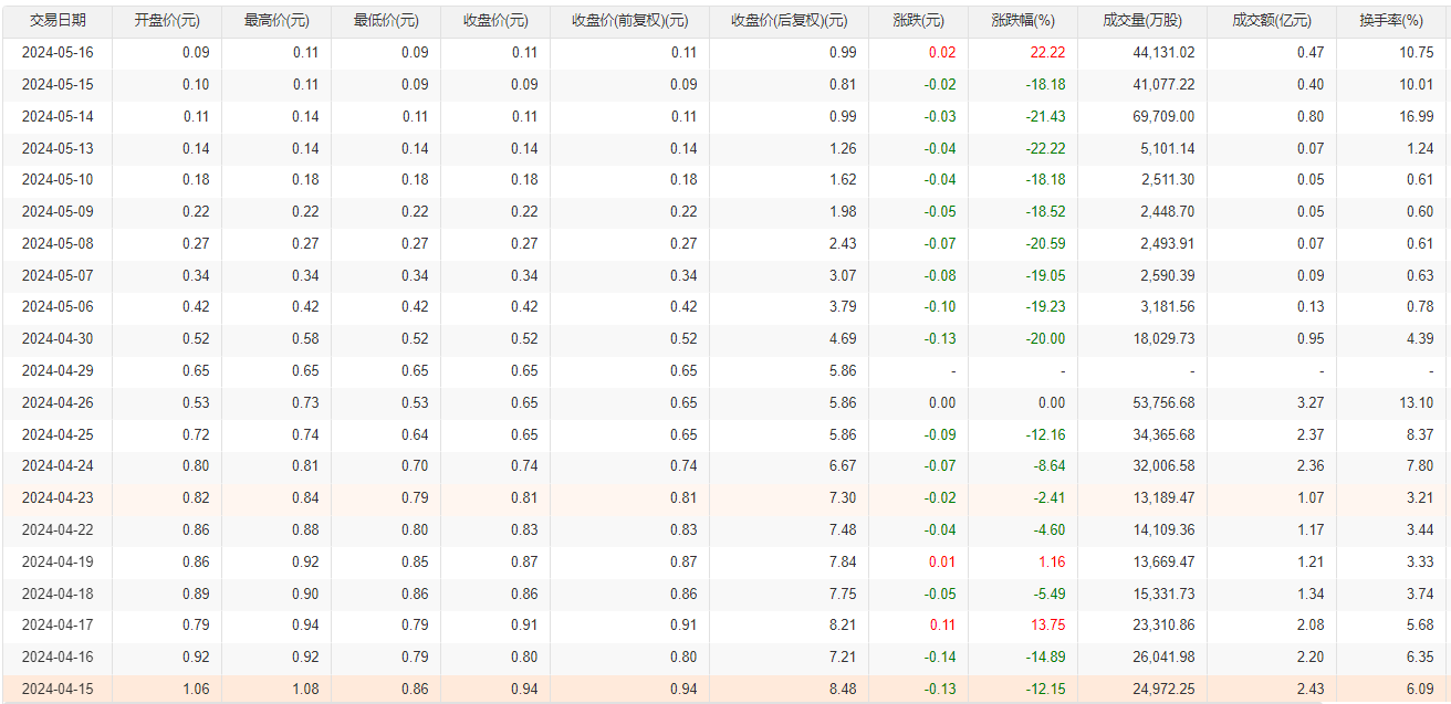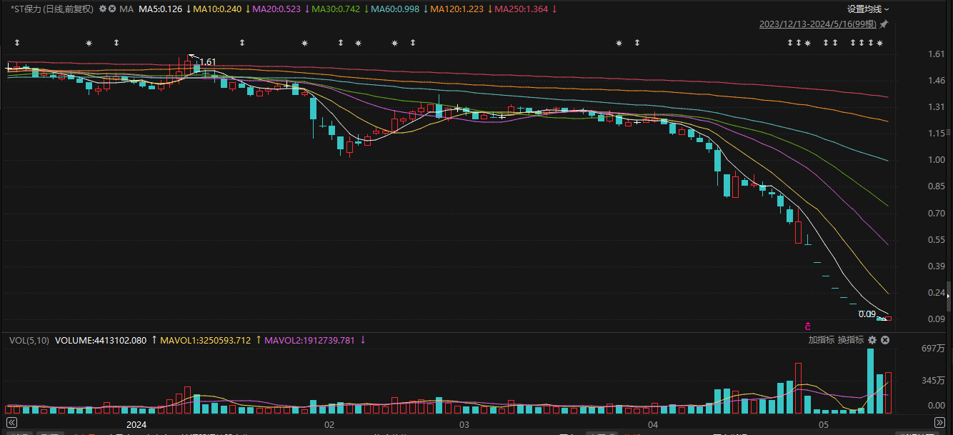 5月16日晚上,*ST保力公告称,从2024年4月16日至5月16日,该股票收盘价连续二十个交易日低于1元,已触及《深圳证券交易所创业板股票上市规则(2024年修订)》第10.2.1条规定的交易类强制退市情形,公司股票将被深圳证券交易所终止上市交易。