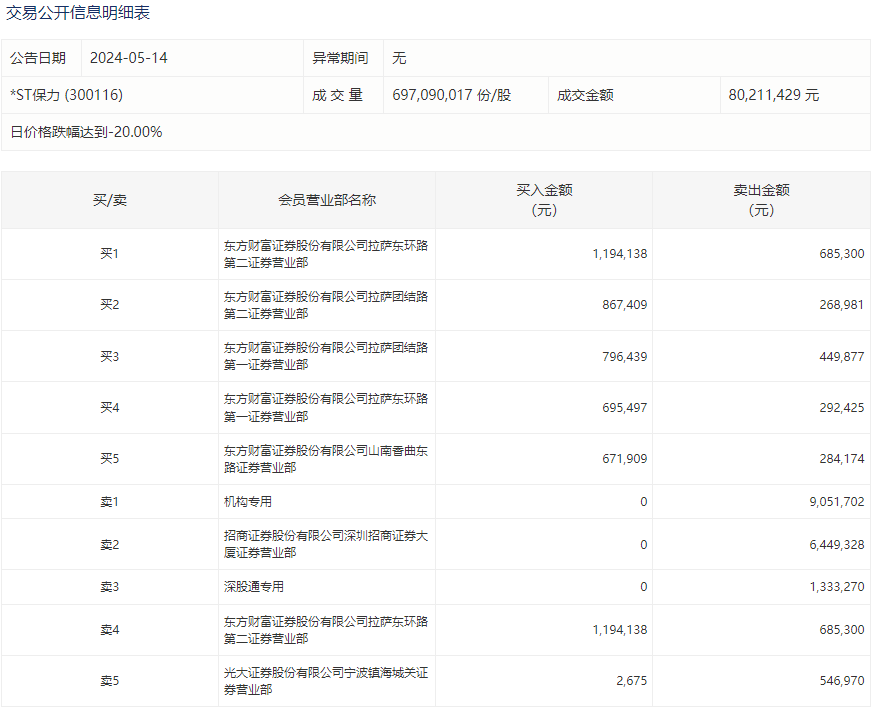 *ST保力5月14日龙虎榜显示,以散户大本营著称的东方财富证券“拉萨帮”交易活跃,占据前五大买入营业部榜单。其中,买一、卖四东方财富证券拉萨东环路第二证券营业部买入119.41万元并卖出68.53万元。