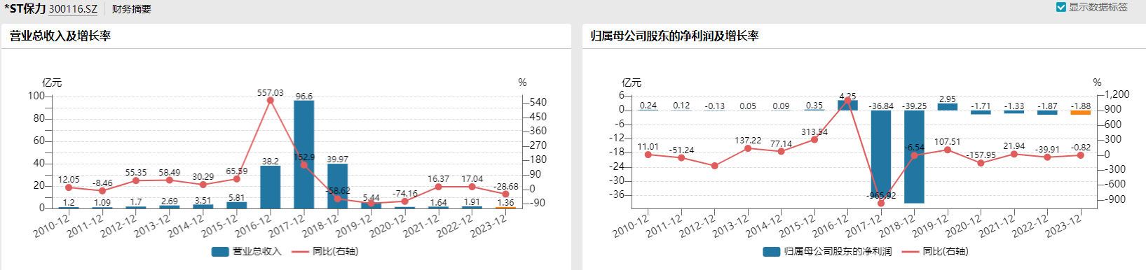 2023年,*ST保力实现营业收入1.36亿元,其中扣除后营业收入仅0.92亿元;归母净利润亏损1.88亿元,且连续多年大额亏损。2023年年报披露后,4月29日,深交所曾向*ST保力下发了年报问询函,要求其说明是否存在虚构交易事项、虚构收入等情形。