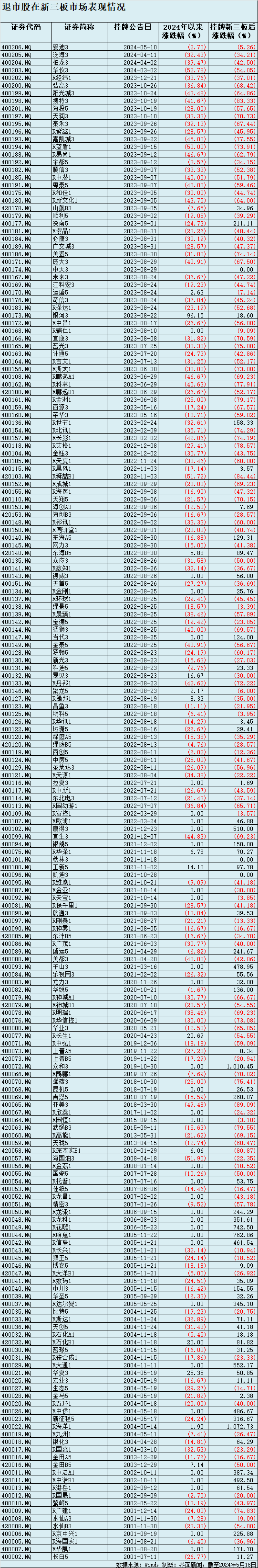 部分投资者或许在期待这些个股退市后进入老三板的交易性机会。不过,界面新闻统计相关新三板退市股情况发现,截至2024年5月16日的198只退市股中,2024年以来近14只股价上涨,148只股价均下滑,占比74.75%。同时,自退到新三板挂牌以来,前述198只退市股中有约60只股价上涨,另外138只退市股到新三板挂牌交易以来股价走低,占比近七成。