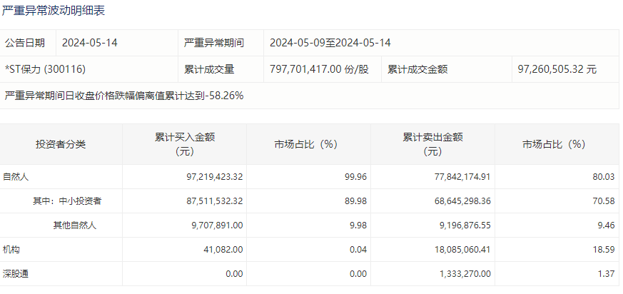 而*ST保力龙虎榜显示,5月9日至5月14日期间,自然人投资者累计买入金额9721.94万元,市场占比99.96%;累计卖出金额7784.22万元,市场占比80.03%。相对来说,机构投资者、深股通则主要是卖出,机构投资者累计买入额4.11万元并累计卖出1808.51万元,深股通则净卖出133.33万元。