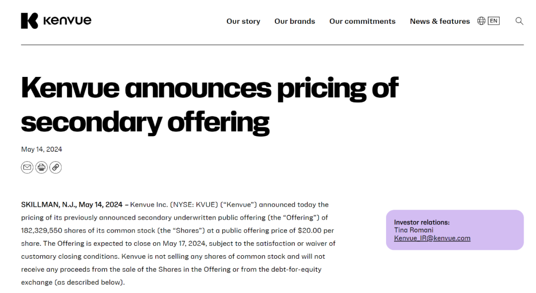 近日,Kenvue官网发布消息称,强生将其在Kenvue公司的剩余9.5%股份,以“债转股”方式出售给高盛和摩根大通。根据每股价格20美元计算,182329550股的预计交易价值约36.47亿美元(约合人民币263亿元),交易计划在5月17日完成。