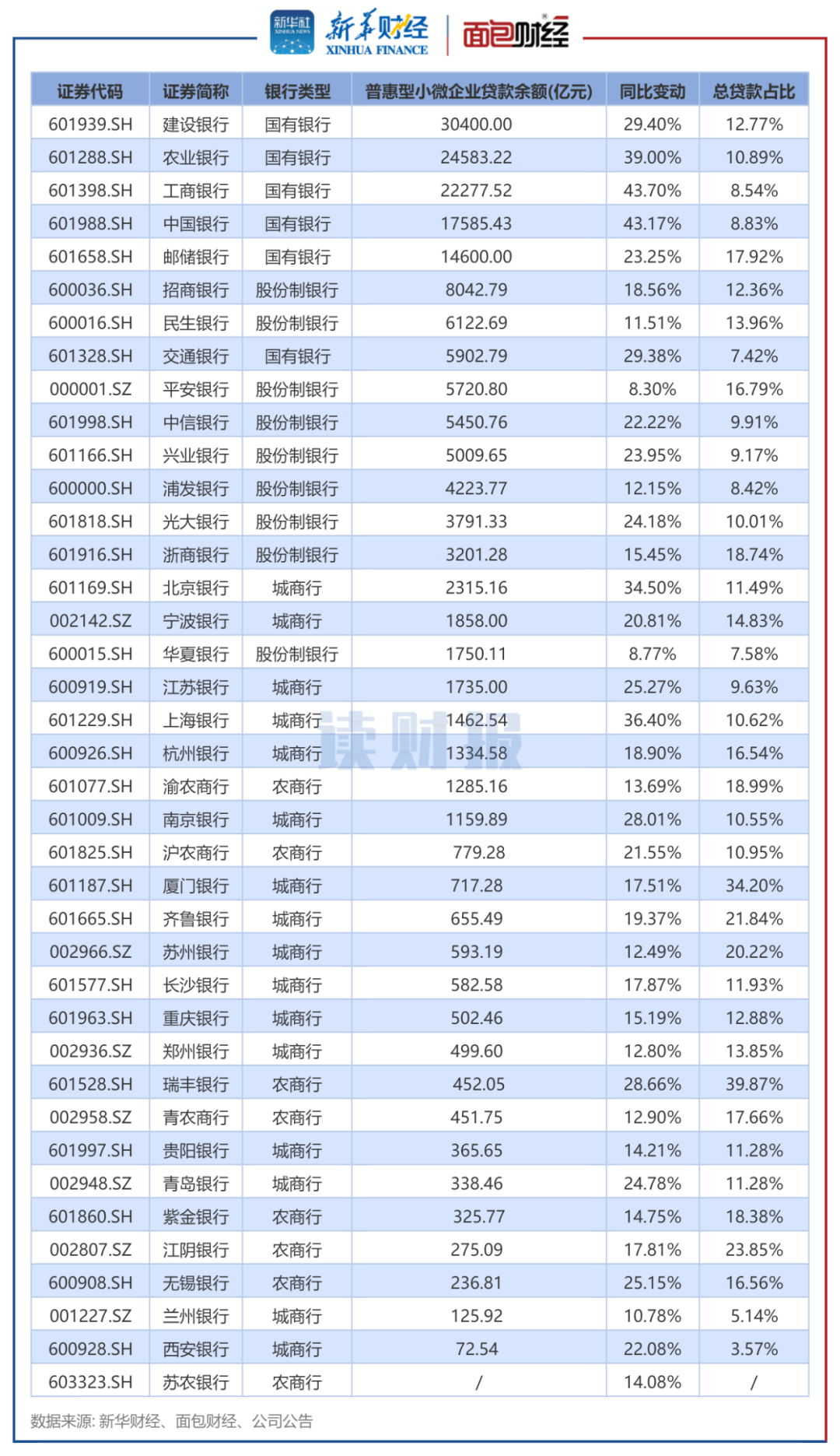 随着2023年报披露完毕,新华财经和面包财经研究员对上市银行普惠金融中普惠小微贷款的相关数据进行了梳理。
