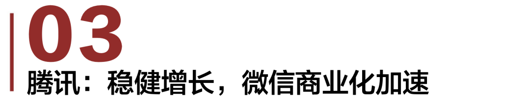 海外游戏的增长基本抵消了国内游戏和会员收入的下滑,广告和云业务贡献了主要收入增量,并进一步成长为核心支柱,累计收入占比超过一半。尤其是得益于微信商业化加速,广告收入增速达到26%。面对大环境,长年克制的微信也不得不开始养家。