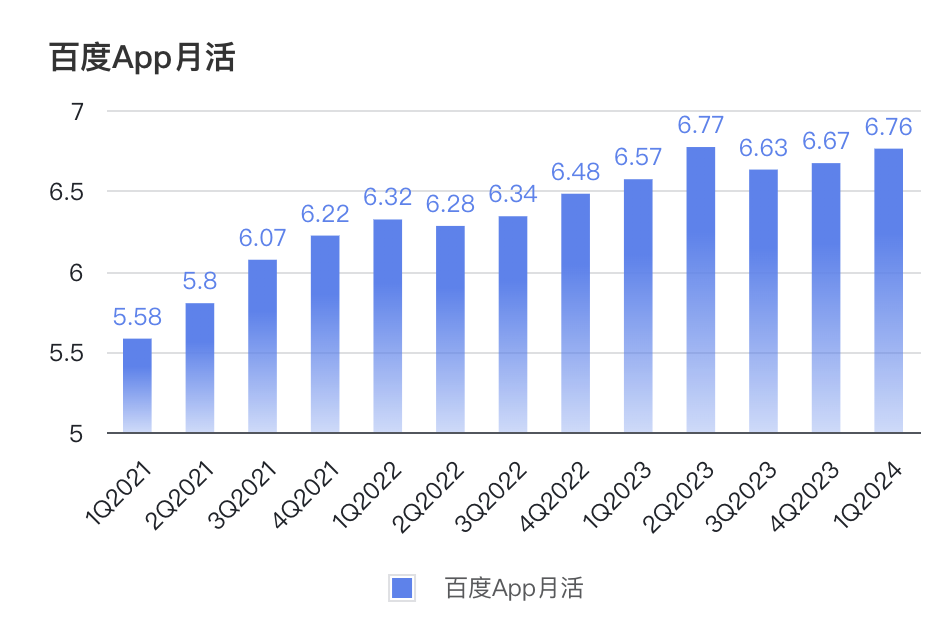 百度的基本面在线广告营收增速继续下滑至2.4%,上个季度的增速还是8%,主要是受微信和小红书等竞品影响。从百度App月活数据来看,同样增速缓慢,6.76亿月活仅比上个季度增加900万。