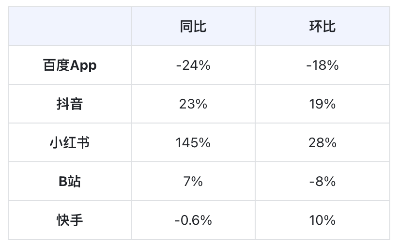 过去半年,百度App的百度指数平均值同比下降24%,环比下降18%。而抖音、小红书、B站、快手等产品指数基本呈现不同幅度的涨幅,其中小红书同比涨幅最大,达到145%。