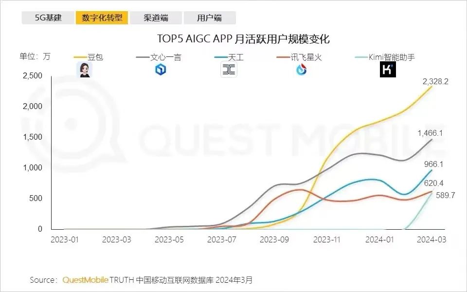而据Questmobile数据显示,抢先发布的文心一言用户数已经字节的豆包大比例反超。3月,豆包月活2328万,而文心一言月活1466万。