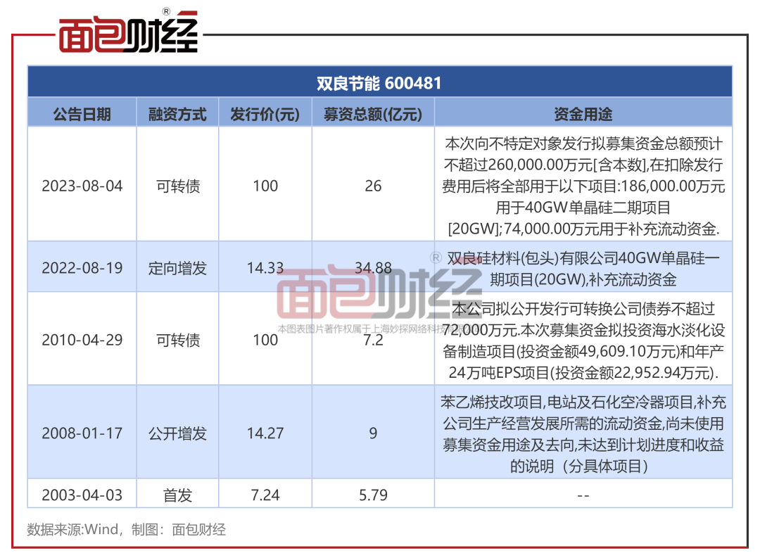 最近一次募资发生于2023年,双良节能通过可转债募资26亿元,资金用于40GW单晶硅二期项目、补充流动资金。