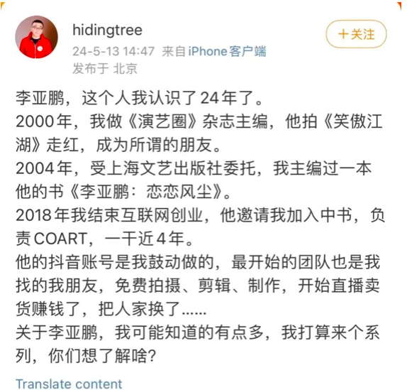 事实上,欠下的债一天没还完,他一天都避不开4000万带来的后续问题。在最新的回应中,李亚鹏表示自“hidingtree”2024年春天离职后,的确还欠后者六万多元左右的补偿,并指明讨薪者的抖音账号名,“希望朋友们多多关注、多多支持他”。