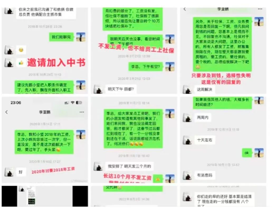 5月13日,博主“hidingtree”晒出了9张聊天记录,称自己与李亚鹏认识24年,曾合作近4年,曝光李亚鹏拖欠员工工资、社保、业务费等长达10个月,自己也被拖欠了一个半月工资,共计75000元。据他介绍,这么多年来自己一直讨要未果,只要涉及到钱,李亚鹏便“选择性失明”。