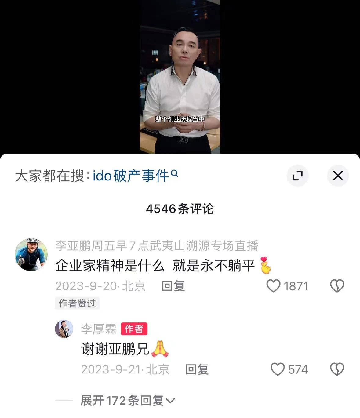 2023年9月,李厚霖发布了第一条抖音视频,回应公司境况,称“当下正是人生的至暗时刻”,李亚鹏也在评论区力挺李厚霖,“企业家精神是什么,就是永不躺平”。