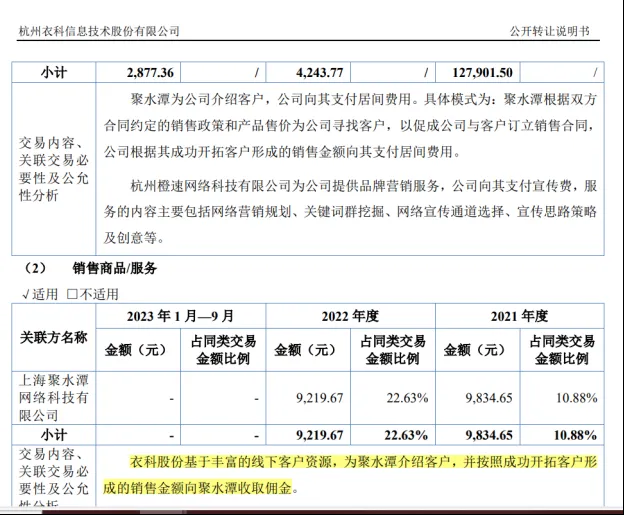 在衣科股份申报稿中,亦提到了上述情况,即聚水潭为公司介绍客户,公司向其支付居间费用(按成功开拓客户形成的销售金额)。
