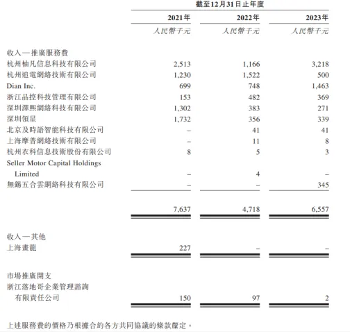其中在“与关联方的交易”相关内容提到,“收入——推广服务费”方面,2021年至2023年(截至12月31日止年度),聚水潭向衣科股份实现的销售金额分别达8000元、5000元、3000元;