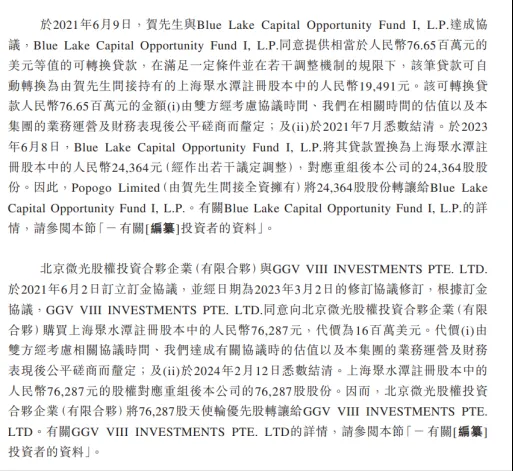在2023年6月8日经调整后,蓝湖资本将该笔贷款置换为聚水潭注册股本中的24364元人民币,对应重组后公司24364股股份。最终,Popogo Limited(由贺兴建间接全资拥有)将24364股股份转让给蓝湖资本。