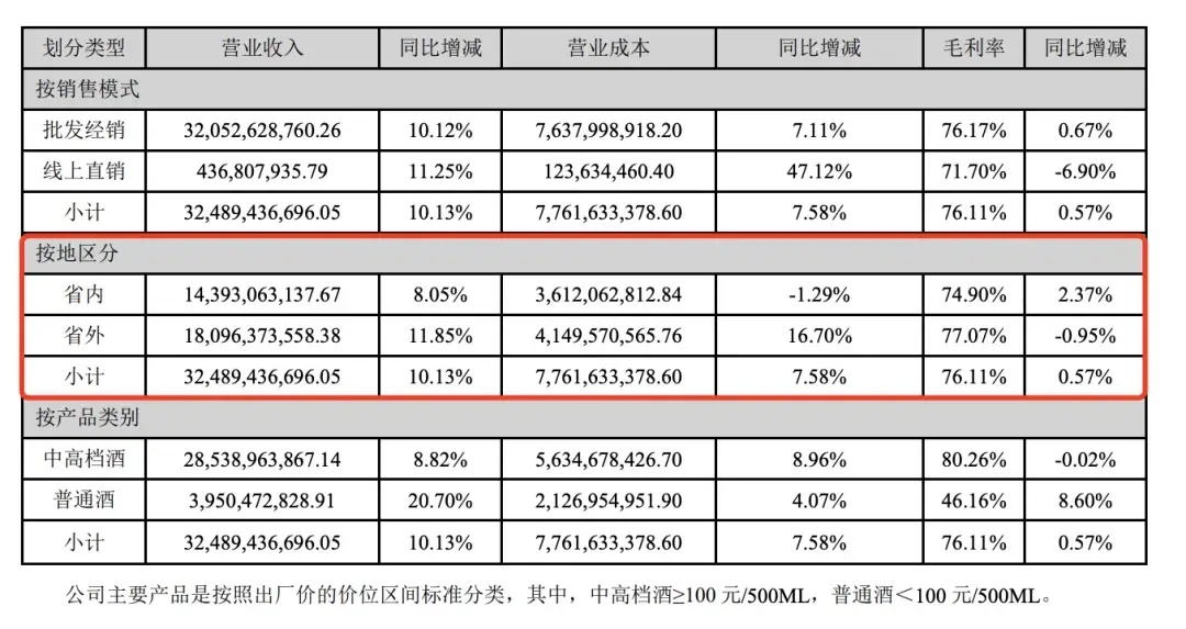 以江苏龙头洋河为例,根据洋河股份年报,2023年洋河江苏省内收入为143.93亿元,占比45%左右,同比增长8.05%,省外收入为180.96亿元,同比增长11.85%。省外市场整体表现优于省内大本营市场。