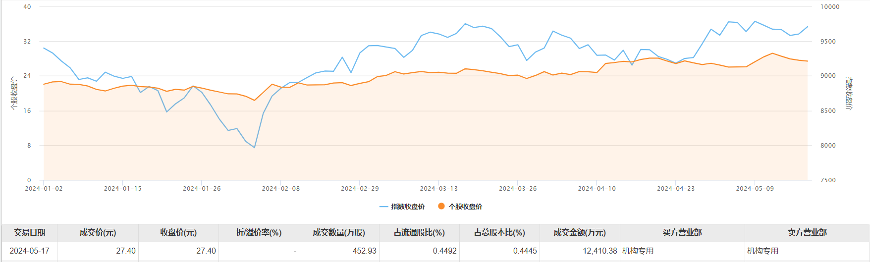 许继电气5月17日大宗交易成交452.93万股,成交额1.24亿元,占当日总成交额的27.01%,成交价27.4元,较市场收盘价27.4元持平。