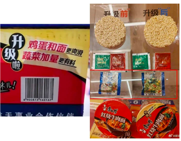从目前的流传的图片来看,新配送的康师傅产品已换上了新包装,上面印有“鸡蛋和面更爽滑,蔬菜加量更有料”等醒目的升级标语。升级后的面饼似乎变得更大,蔬菜料包更多,包装规格更大。
