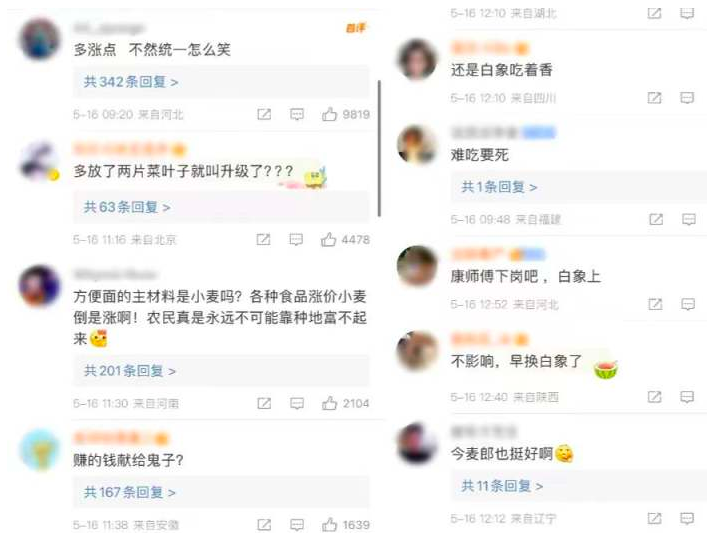 对此,网友的反应也非常激烈,5月16日中午,#康师傅方便面即将全线涨价#冲上热搜第一,不少人表示:不吃了,吃白象、上统一。