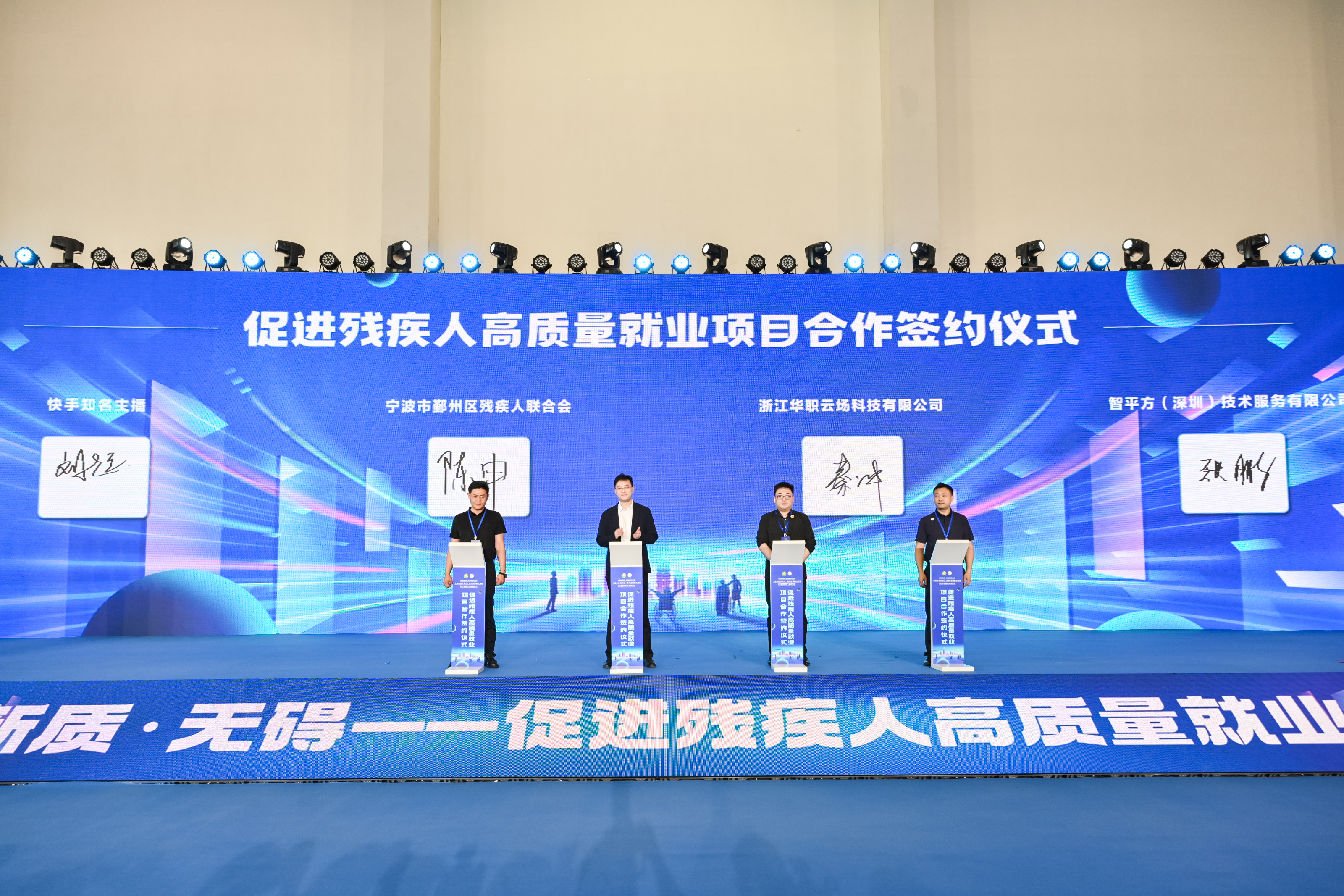 本次活动以“科技助残,共享美好生活”为主题,以“新质·无碍——促进残疾人高质量就业”为活动主旨,充分展示了残疾人事业的最新发展和科技在促进残疾人就业方面的重要作用。活动现场发布宁波市就业成果典型案例及优秀项目,举办了促进残疾人高质量就业的“光”访谈,快手知名招聘主播、华职云场总裁和上海人工智能试验室、央广网相关代表等分别从拓宽残疾人就业渠道、引进残疾人就业新模式、创造残疾人就业新岗位和扩大残疾人就业影响力四个方面进行了交流对话。同时鄞州区残联还与各方代表现场签订了促进残疾人就业合作协议,持续完善残疾人保障和就业体系。