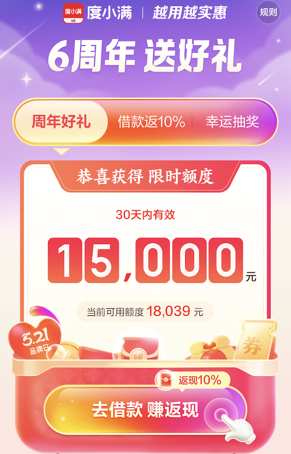 据悉,度小满“六周年用户回馈日”活动将于2024年5月21日正式启动,一直持续至今年6月30日。用户登录度小满App/有钱花App/度小满小程序主页面即可参与,其中包括周年庆好礼、借款返10%、幸运抽奖等多重福利回馈活动,有机会获得最高20万元临时额度或年化利率低至4.9%的低价资金,并有借款返现金、666元现金红包、30天免息券、200元京东购物卡等多重好礼相送,中奖概率高达100%。