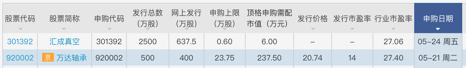 此外,5月24日周五,市场也可申购创业板公司汇成真空(301392.SZ),其发行总数为2500万股,网上发行637.5万股,申购上限为0.6万股,顶格申购需配市值6万元,公司所属行业的市盈率为27.06倍。