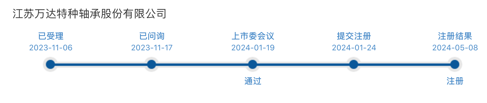 万达轴承在2023年1月12日于新三板挂牌,10个月左右的时间便进行申报,北交所的受理时间是2023年11月6日,2024年1月19日通过北交所上市委的审议,2024年1月24日提交注册,5月8日注册完成,5月10日批复落地。如今更是在5月21日进行申购,万达轴承可谓是“兵贵神速”。据悉万达轴承拟募1.037亿元。