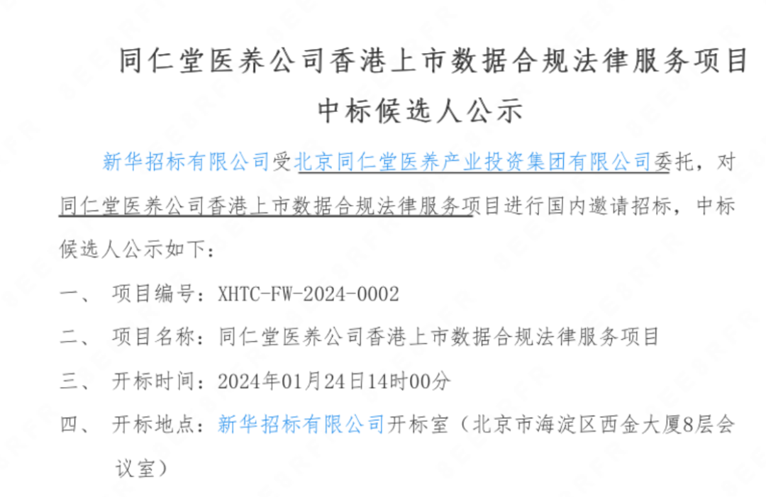 扭亏为盈后,同仁堂医养也紧锣密鼓的开展了上市工作。2023年,同仁堂医养针对股改及其他内控服务、改制财务顾问、香港联交所主板上市综合服务、香港上市数据合规法律服务等项目公开招标。