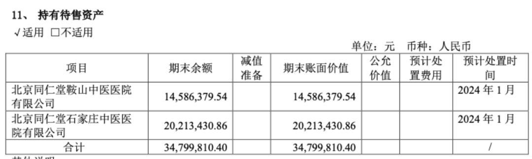 2023年7月,同仁堂子公司北京同仁堂商业投资集团有限公司,将持有的北京同仁堂鞍山中医医院、北京同仁堂石家庄中医医院51%的股权转让给同仁堂医养,转让对价分别为 600.29元、46.92万元。