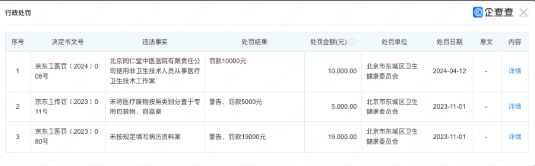 企查查显示,2023年11月至今,同仁堂中医医院三次被处罚,原因包括使用非卫生技术人员从事医疗卫生技术工作;未将医疗废物按照类别分置;未按规定填写病历资料案。罚款合计3.4万元。