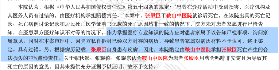 最终,法院认定,由鞍山中医院承担张殿臣死亡产生的合法损失的70%赔偿责任。关于张秋影、张耀德、张耀宗三人认为,鞍山中医院为张殿臣用药为吗啡非安定且为导致其死亡的原因的意见,因未提供充分证据,不予支持。