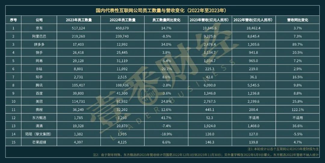 拼多多是中概互联网公司中人均营收最高的,另外,拼多多也成为了1万人以上的互联网公司中,去年增员最猛烈的。它2023年员工人数超过了17000人,同比增长34%。