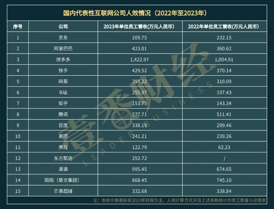 5月14日,阿里与腾讯同一天发布今年Q1财报,健康增长成为二者的共同表达,但同时,“降本”这件事依旧在横行,以阿里为例,一季度减少了超过1.4万员工,放到更长远的时间,从2021年12月底到现在,阿里少了5.4万人。“降本”背后,人效这一词也逐渐成为互联网界的高度认知。不断创造增长奇迹的拼多多,以2023年为例,约1.7万人员规模做到了2476亿元营收,而另一边的京东则在51万员工的情况之下于2023年完成了10846.6亿营销,拼多多的人效着实让市场和竞争对手为之惊艳;在今年3月份,字节跳动的飞书宣布裁员,根据晚点LatePost报道,飞书每人每年带来的订阅收入约为28万元,低于字节平均工资成本,让外界理解了字节跳动为何砍刀劈向飞书,也让关于互联网人效的讨论再度蔓延……