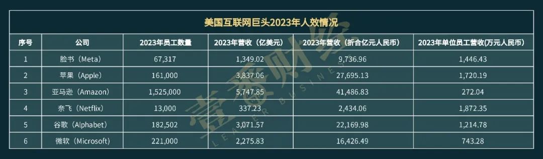 同时,我们也把目光投向了美国,进一步统计了六家美国互联网巨头的营收人效情况,Meta、苹果、奈飞和谷歌都在1000万元以上。