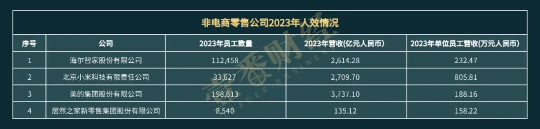 海尔、美的和居然之家的营收人效都不高,分别是232万元、188万元和158万元,和美团、京东、携程什么的差不多。