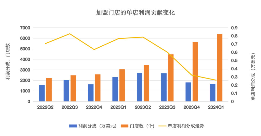 我们通过对比自2022年Q2以来的当季利润分成、加盟门店总数,发现自从2023年Q3开始,联营门店单店利润贡献下降明显。从2022年Q2的平均4.7万元(0.70万美元),下降到1.86万元(0.25万美元)。当然不排除瑞幸公司在价格战期间,主动调整扣点方案以对加盟商补贴。