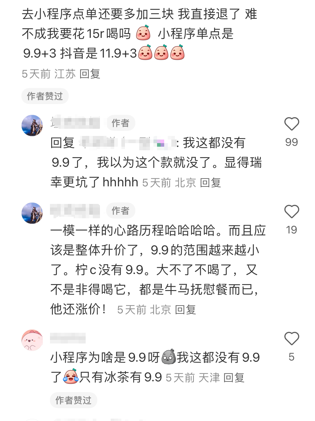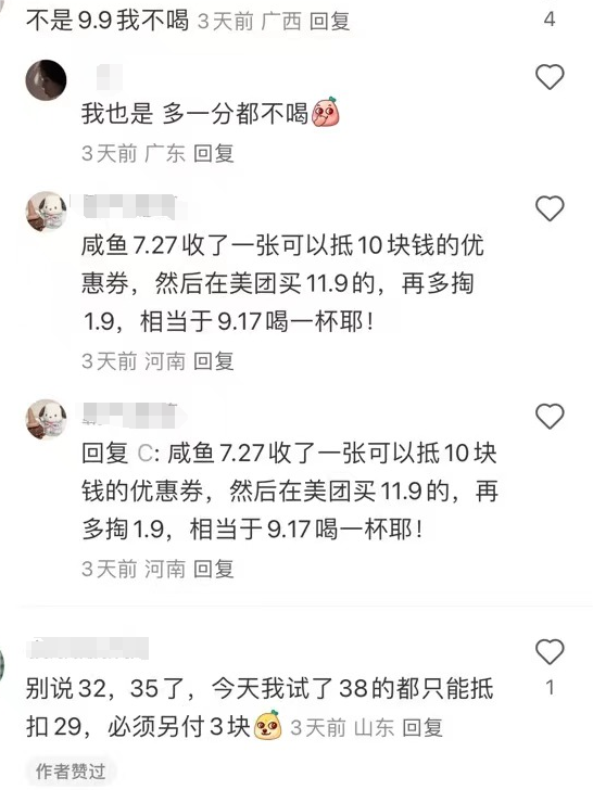 为此有人不解:调价或促销与否都是商家的自由和正常市场行为,消费者怎么还「矫情」到抗议联盟的程度了呢?即便没有9.9优惠券,一杯13.9元的生椰拿铁,跟星巴克比起来也是便宜很多了。
