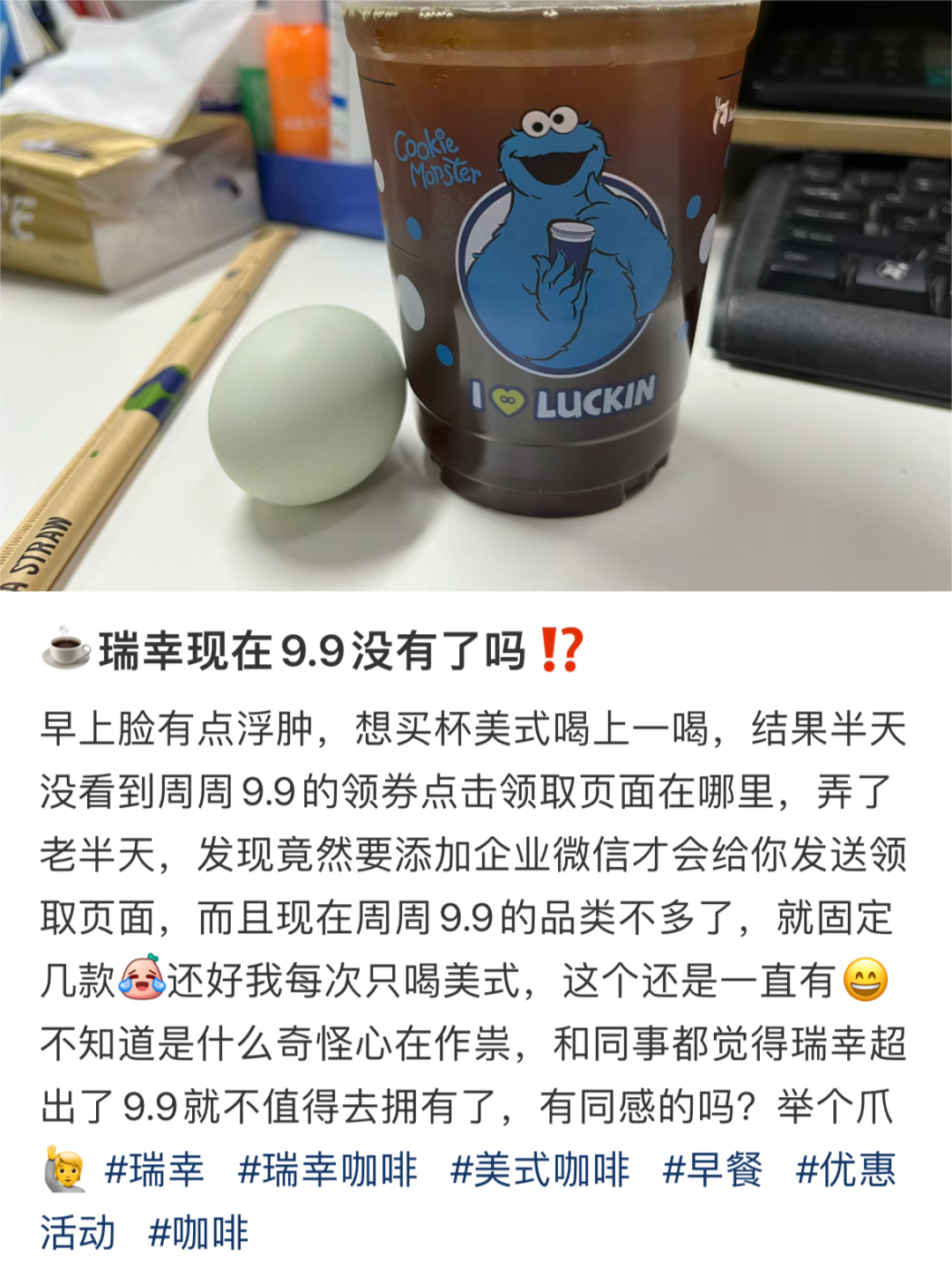 在小红书上,有瑞幸用户吐槽,卖的9.9元团购券,以为橙C美式超大杯,买完才发现是大杯,点单时加3元可升杯,「咱就说,这个9.9还不如没有」。