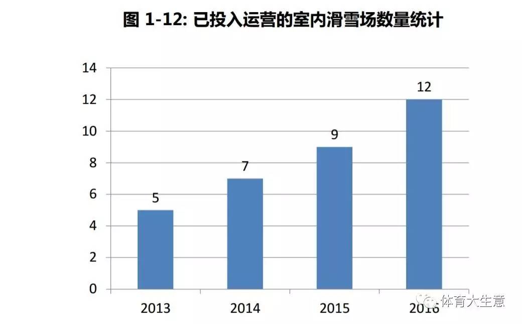 室内滑雪场数量是另一个足以证明南方滑雪产业发展的数据,因为南方地区冬天气候温暖,如非室内人工造雪,将无法架设起码的滑雪环境。2016年,国内室内滑雪场数量从9家增加至12家。